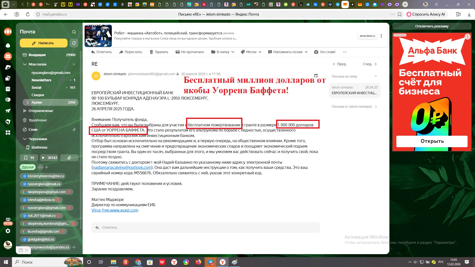 Это "бесплатный" миллион долларов от якобы Уоррена Баффета. 26 апреля 2025 год.