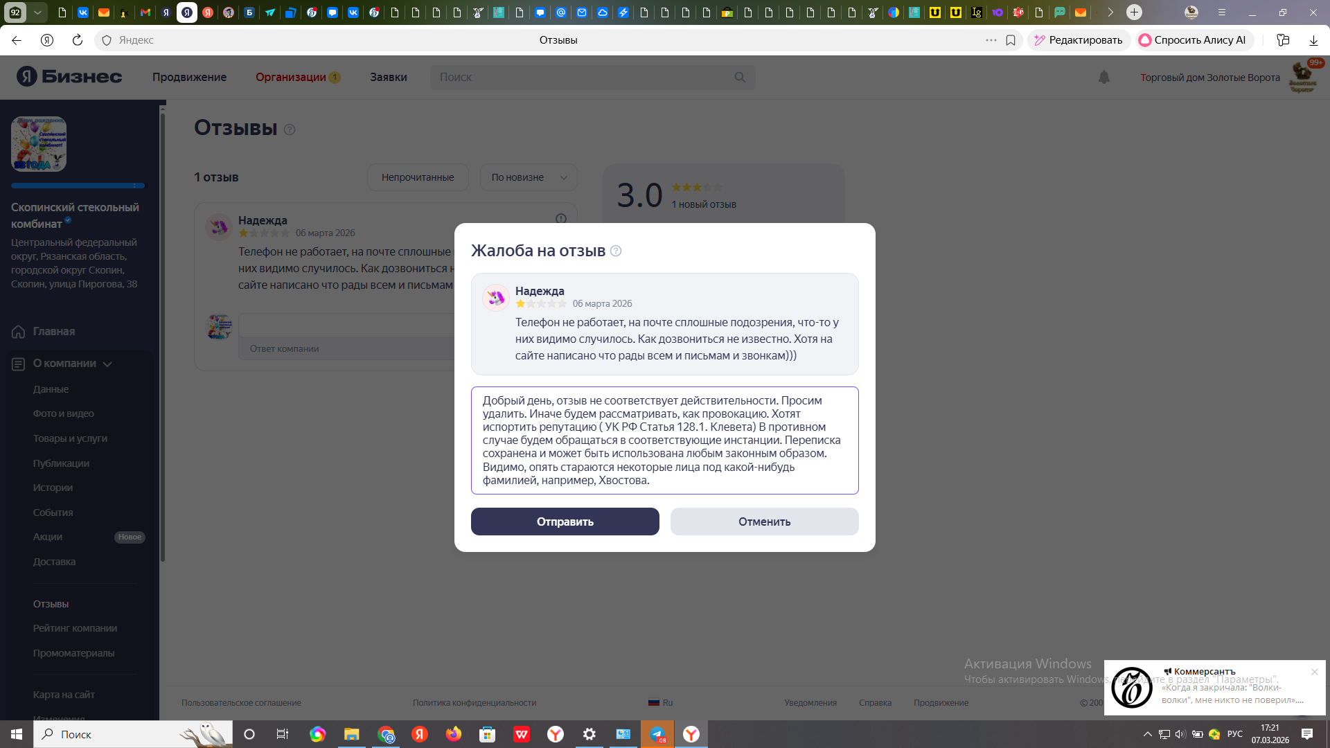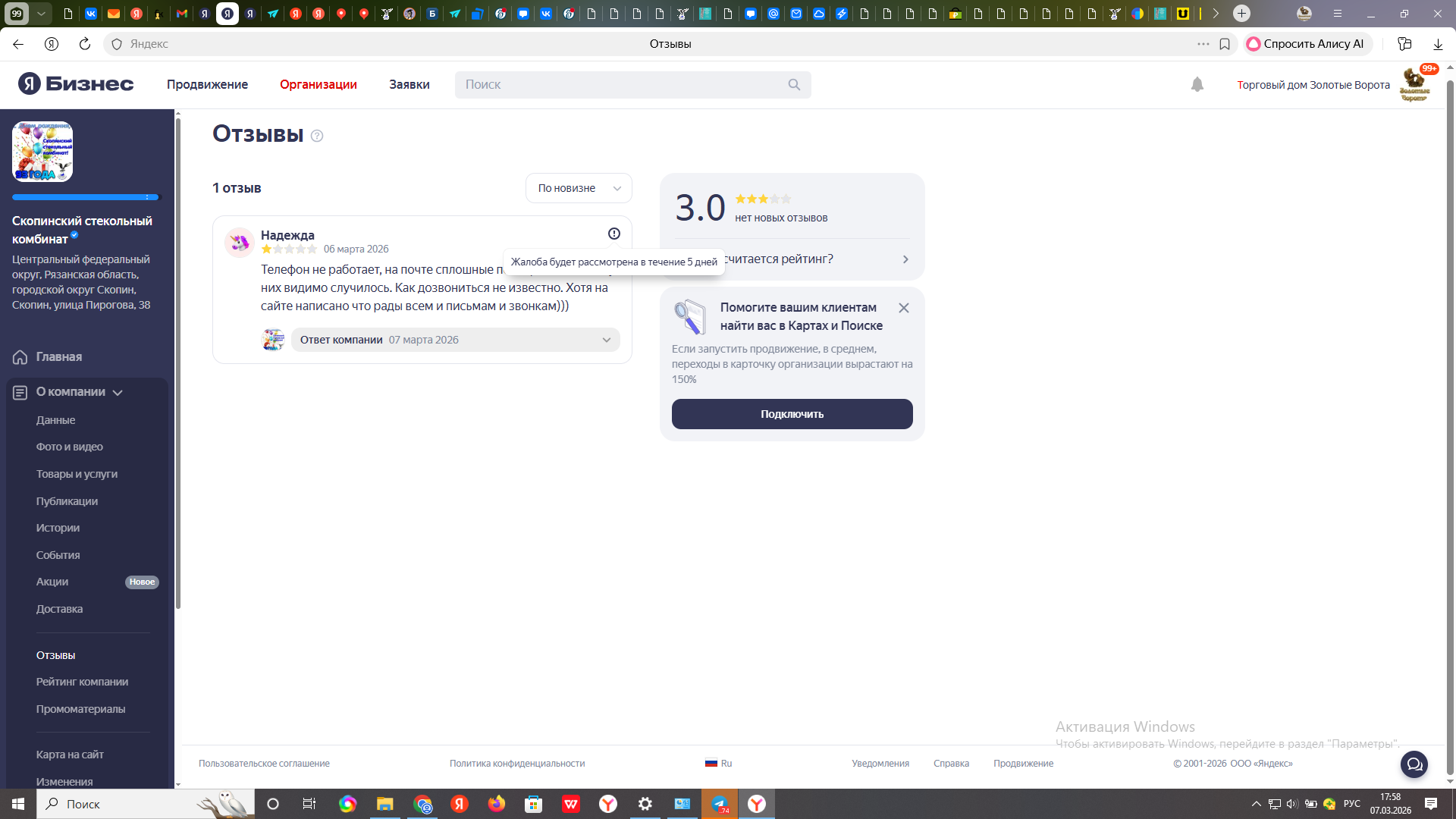6 марта 2026 года в своем аккаунте Скопинского стекольного комбината находим отзыв. В нем сказано, что нам дозвониться нельзя, на почте сплошные подозрения.