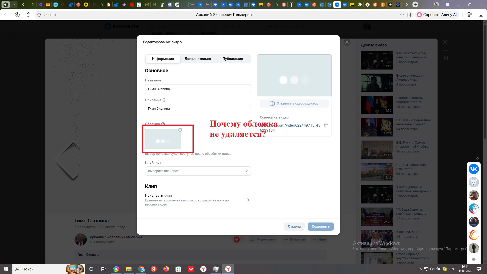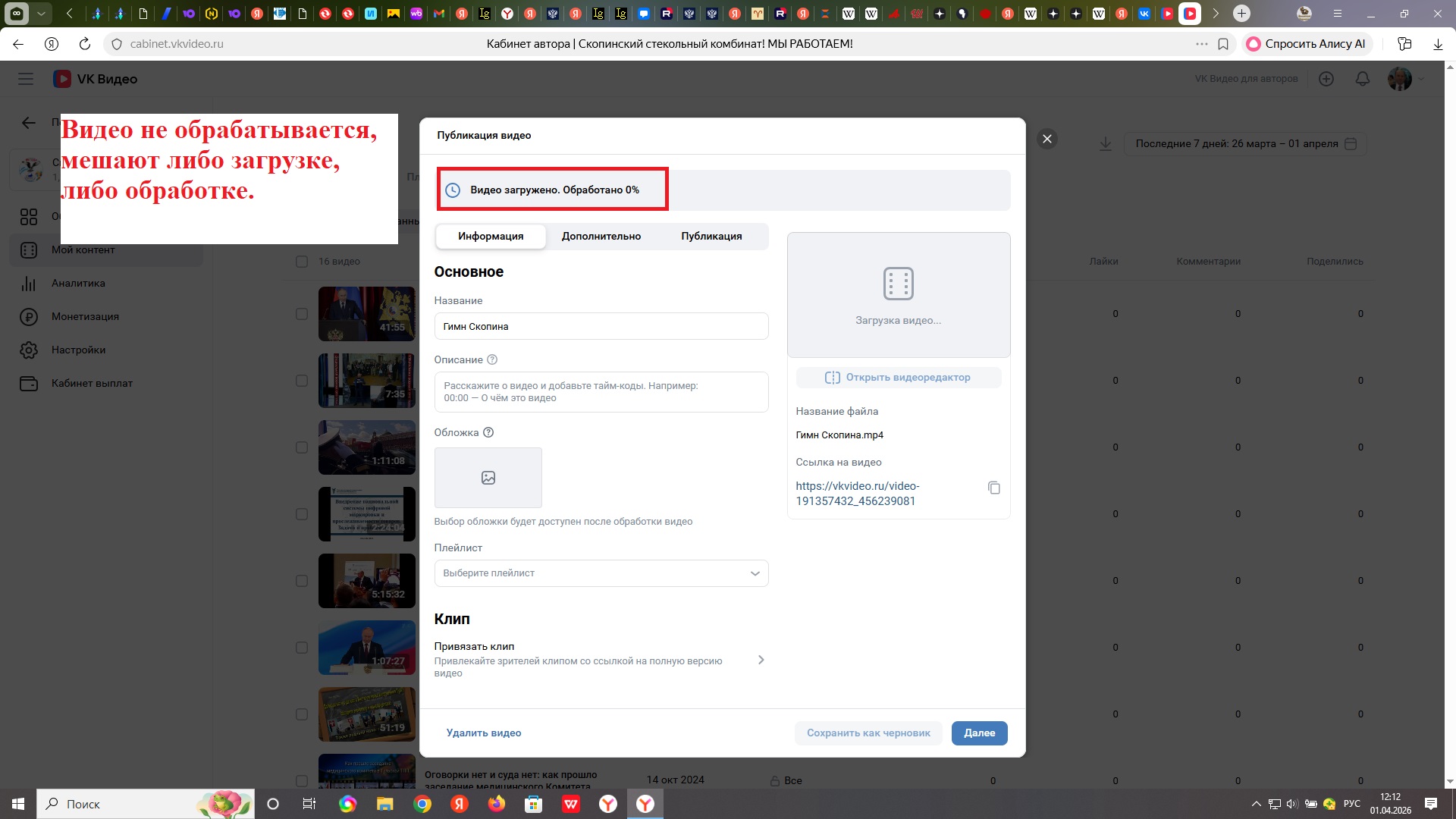 Кульминации история достигла при публикации в "ВК". Пошли помехи сначала при сохранении, потом при обработке видео. Какое-то время видео висело просто с надписью, что оно обрабатывается.